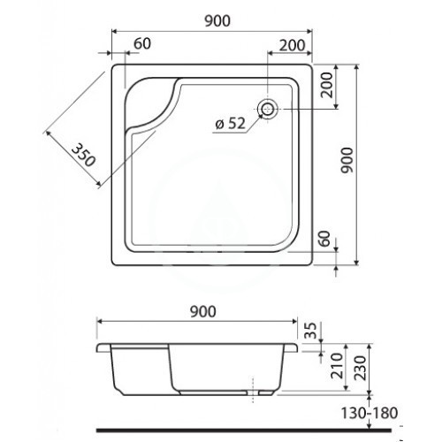 Hluboká sprchová vanička rozměry 900 x 900 mm hloubka vaničky 21 mm odtok o průměru 52 mm samonosná, pro obložení barva bílá materiál: akrylát Lucite® Ilustrativní foto (celý popis)