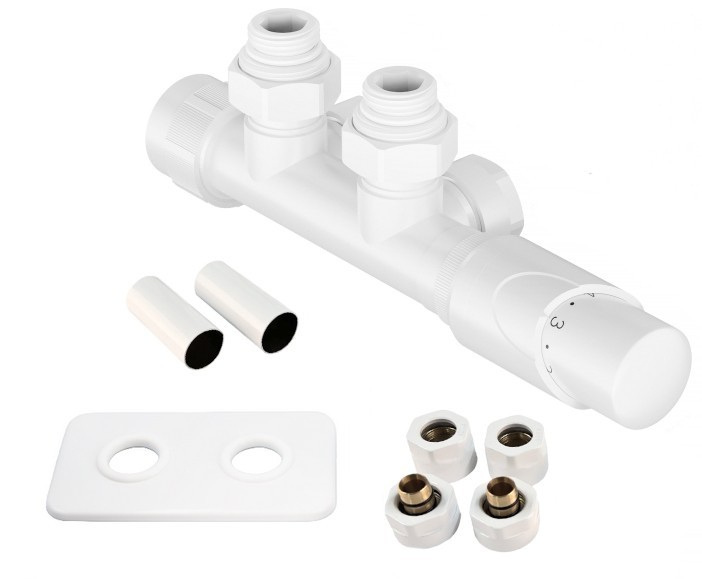 Středová oboustranná (levá i pravá) termostatická sada HYBRID vč. krycí rozety a 2 krycích trubiček (mosaz) je určena pro připojení radiátorů na rozvody TUV s vývodem ze zdi s roztečí 50mm.