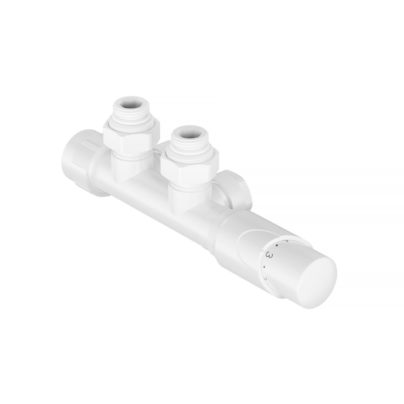 Středová oboustranná (levá i pravá) termostatická sada HYBRID vč. krycí rozety a 2 krycích trubiček (plast) je určena pro připojení radiátorů na rozvody TUV s vývodem ze zdi s roztečí 50mm.