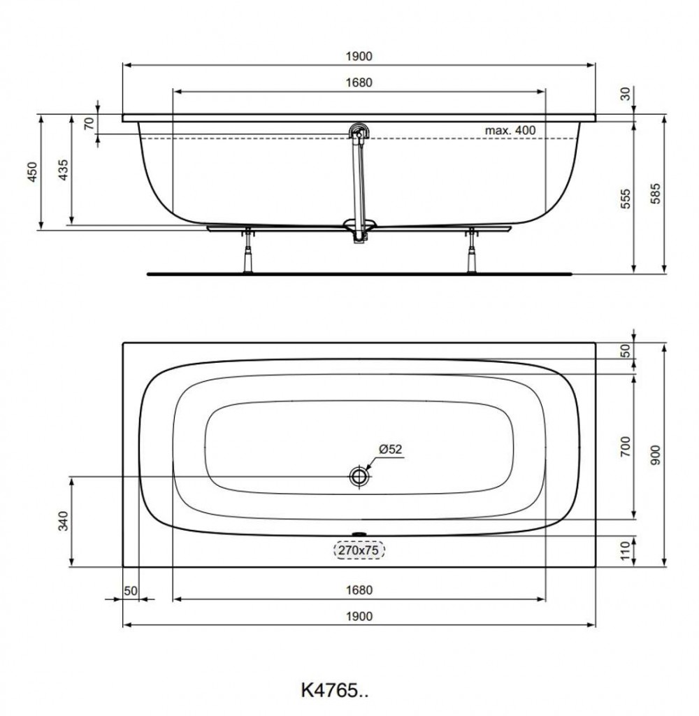 - odtok uprostřed: průměr 52 mm