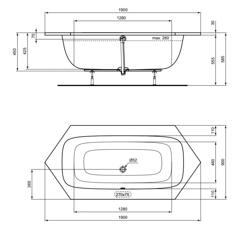 - odtok uprostřed: průměr 52 mm