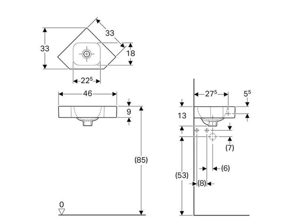Rohové umývátko bez přepadu a bez otvoru pro baterii