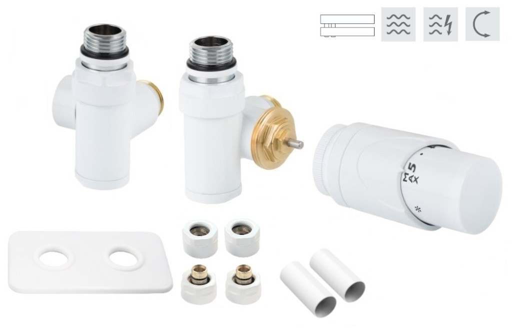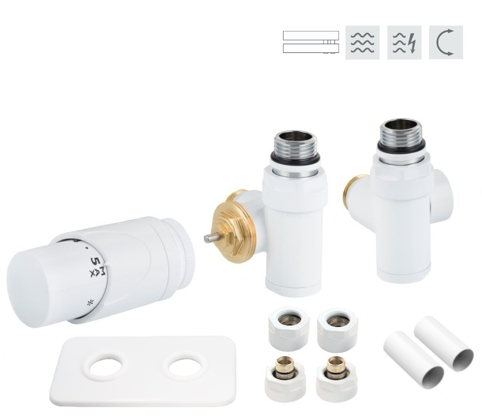 Rohová oboustranná (levá i pravá) termostatická sada INTEGRATO vč. 1 krycí rozety a 2 krycích trubiček (mosaz) je určena pro připojení radiátorů na rozvody TUV s vývodem ze zdi s různou roztečí (krajní připojení). Sada umožňuje přímé osazení elektrické topné tyče.