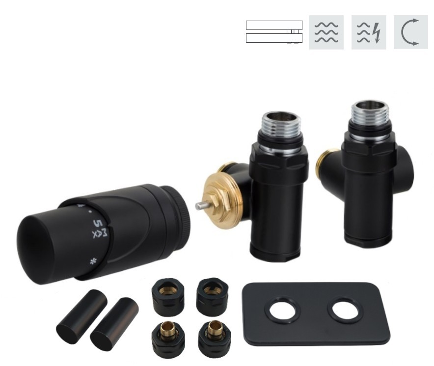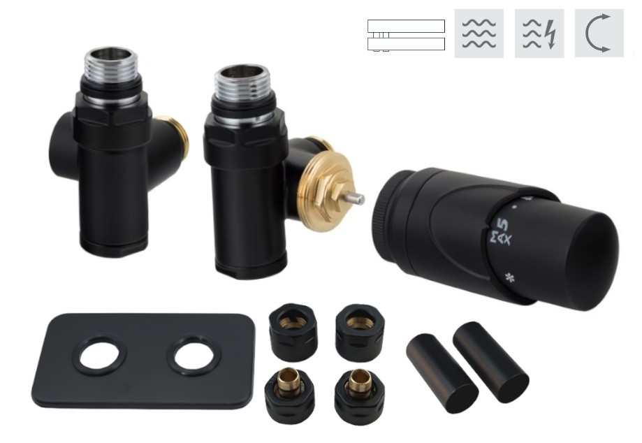 Rohová oboustranná (levá i pravá) termostatická sada INTEGRATO vč. 1 krycí rozety a 2 krycích trubiček (mosaz) je určena pro připojení radiátorů na rozvody TUV s vývodem ze zdi s různou roztečí (krajní připojení). Sada umožňuje přímé osazení elektrické topné tyče.