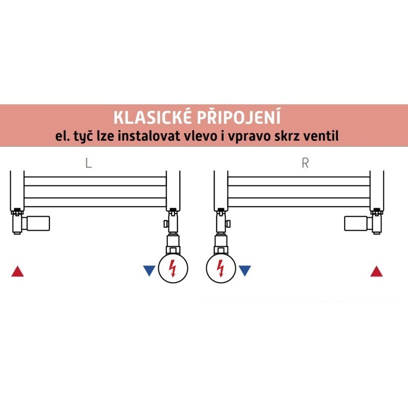 Pro kombinovaný provoz u klasických radiátorů musíte objednat sadu + el. tyč v doporučeném výkonu, kterou můžete instalovat skrz ventil vlevo nebo vpravo do radiátoru