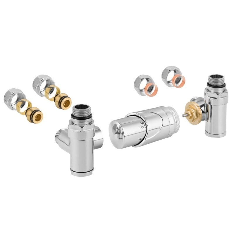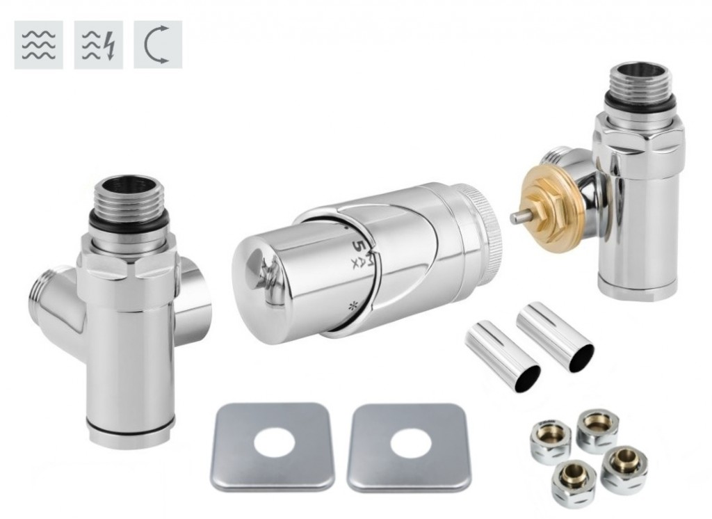 Rohová oboustranná (levá i pravá) termostatická sada INTEGRATO vč. krycí rozety a 2 krycích trubiček (mosaz) je určena pro připojení radiátorů na rozvody TUV s vývodem ze zdi s různou roztečí (krajní připojení). Sada umožňuje přímé osazení elektrické topné tyče.