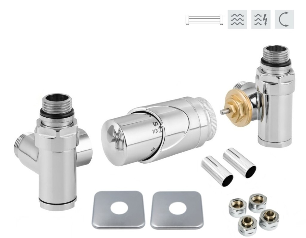 Rohová oboustranná (levá i pravá) termostatická sada INTEGRATO vč. 2 krycích rozet a 2 krycích trubiček (mosaz) je určena pro připojení radiátorů na rozvody TUV s vývodem ze zdi s různou roztečí (krajní připojení). Sada umožňuje přímé osazení elektrické topné tyče.