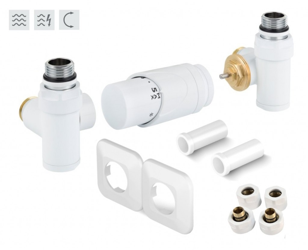 Rohová oboustranná (levá i pravá) termostatická sada INTEGRATO vč. krycí rozety a 2 krycích trubiček (plast) je určena pro připojení radiátorů na rozvody TUV s vývodem ze zdi s různou roztečí (krajní připojení). Sada umožňuje přímé osazení elektrické topné tyče.