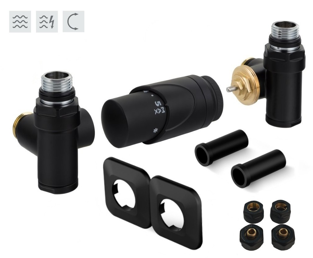Rohová oboustranná (levá i pravá) termostatická sada INTEGRATO vč. krycí rozety a 2 krycích trubiček (plast) je určena pro připojení radiátorů na rozvody TUV s vývodem ze zdi s různou roztečí (krajní připojení). Sada umožňuje přímé osazení elektrické topné tyče.