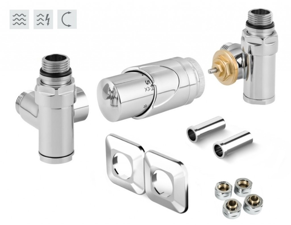 Rohová oboustranná (levá i pravá) termostatická sada INTEGRATO vč. krycí rozety a 2 krycích trubiček (plast) je určena pro připojení radiátorů na rozvody TUV s vývodem ze zdi s různou roztečí (krajní připojení). Sada umožňuje přímé osazení elektrické topné tyče.