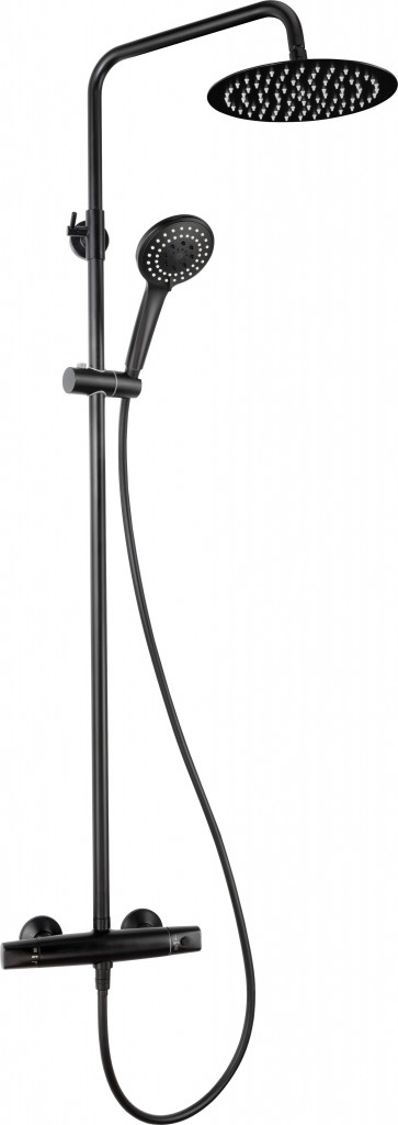 Sprchový sloup JASMIN s nástěnnou sprchovou termostatickou baterií je dostupný v černém provedení. Baterie je vybavena nejkvalitnější termostatickou kartuší se zámkem 38°C. Kartuše chrání před náhlými změnami teploty a zaručuje pohodlné používání baterie po léta.