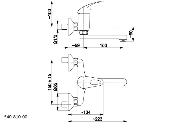 Nástěnná umyvadlová baterie JASPIS od výrobce KFA ARMATURA s roztečí 150 mm. Výhodou je otočné ramínko o délce 150 mm a perlátorem.