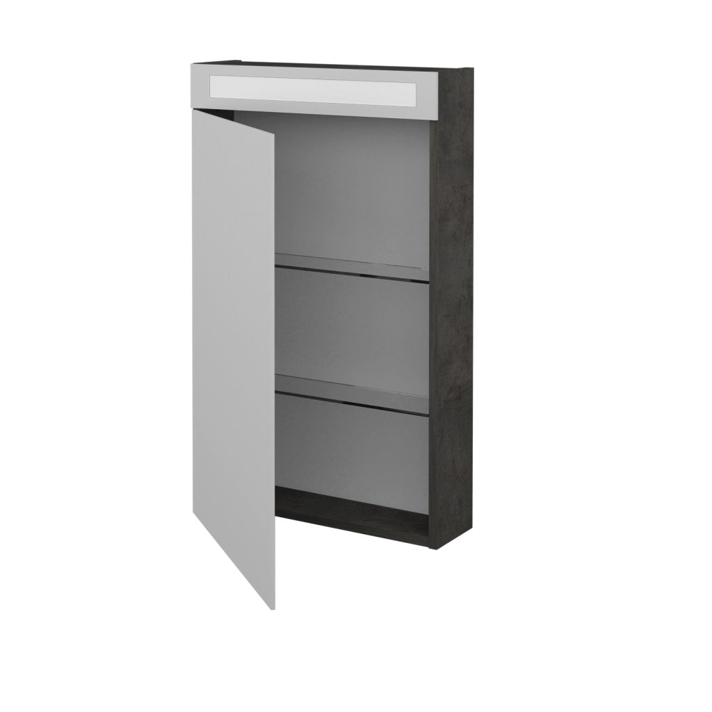 Zrcadlová skříňka AIR GAOE 50 je vyrobena v jednodveřovém provedení s oboustranným zrcadlem, u kterého si můžete zvolit, zda chcete pravo nebo levostranné otevírání. Zrcadlo je ke korpusu připevněno pomocí značkových pantů Grass. Jejich přichycení k zrcadlovině je možné díky patentem chráněné a v Dřevojasu zkonstruované liště.