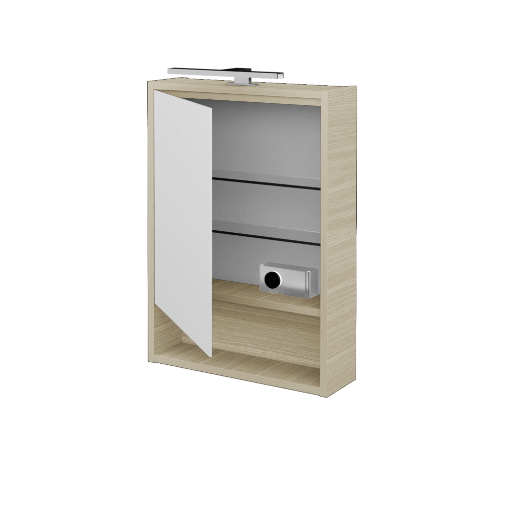 ParametryGalerka FOCUS GAOE 50 je konstruována jako jednodveřová s oboustranným zrcadlem. Vnitřní prostor galerky je rozdělen pomocí 2 skleněných a nastavitelných polic, díky čemuž vzniká praktický prostor pro uložení všech doplňků, jako je kosmetika, hygienické potřeby atd. Velkou výhodou galerky je el. zásuvka 230 V (uvnitř galerky) a vypínač pro (5 W, teplota 4 000 K). Galerka splňuje krytí IP 44.