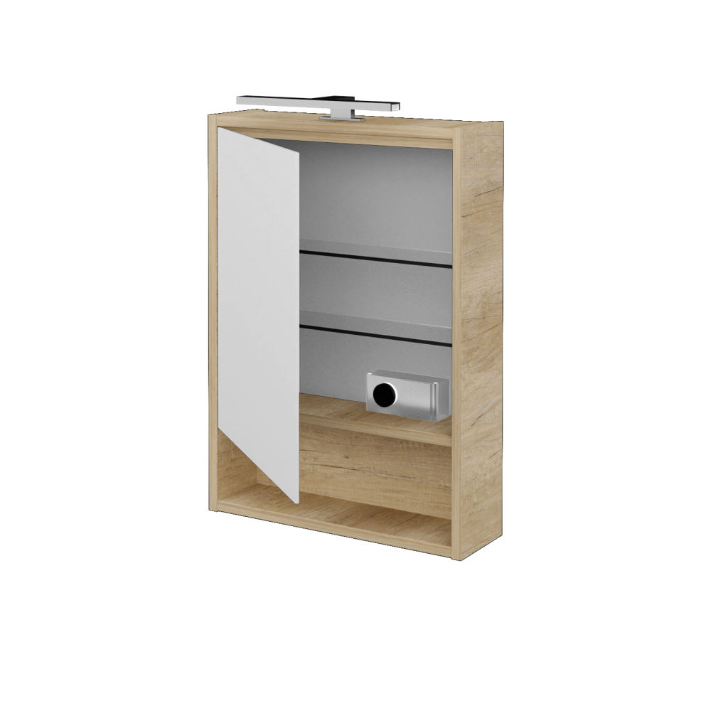 ParametryGalerka FOCUS GAOE 50 je konstruována jako jednodveřová s oboustranným zrcadlem. Vnitřní prostor galerky je rozdělen pomocí 2 skleněných a nastavitelných polic, díky čemuž vzniká praktický prostor pro uložení všech doplňků, jako je kosmetika, hygienické potřeby atd. Velkou výhodou galerky je el. zásuvka 230 V (uvnitř galerky) a vypínač pro (5 W, teplota 4 000 K). Galerka splňuje krytí IP 44.