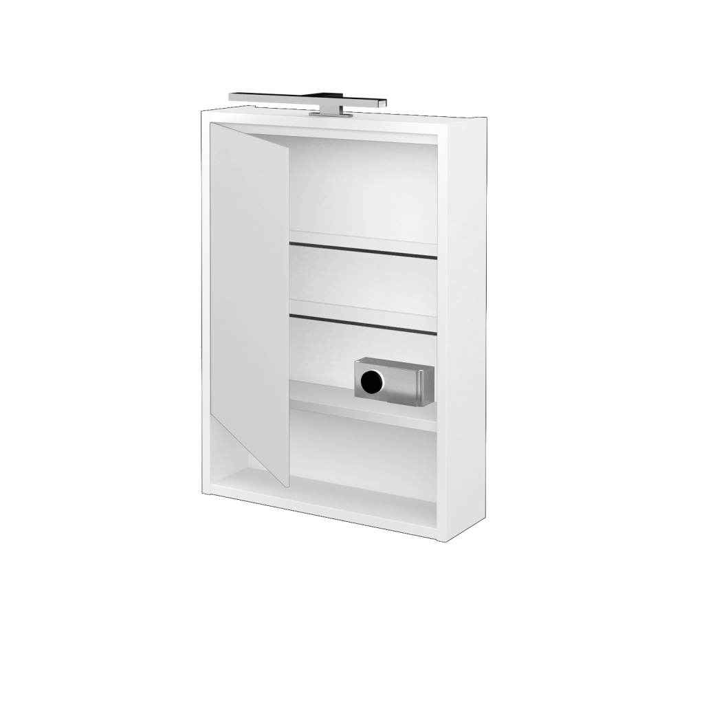 Galerka FOCUS GAOE 50 je konstruována jako jednodveřová s oboustranným zrcadlem. Vnitřní prostor galerky je rozdělen pomocí 2 skleněných a nastavitelných polic, díky čemuž vzniká praktický prostor pro uložení všech doplňků, jako je kosmetika, hygienické potřeby atd. Velkou výhodou galerky je el. zásuvka 230 V (uvnitř galerky) a vypínač pro (5 W, teplota 4 000 K). Galerka splňuje krytí IP 44.