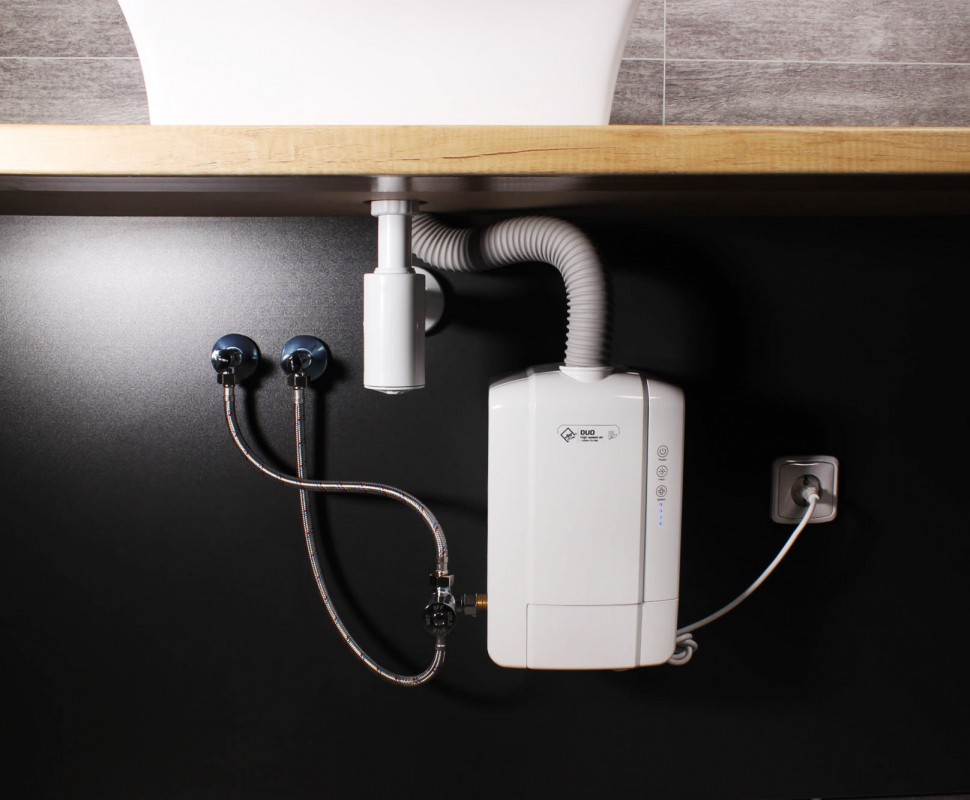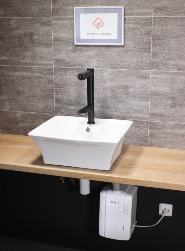 Instalace vysoušeče ve vodovodní baterii Jet Dryer DUO je možná bez nutnosti zásadních stavebních úprav. Jednotka se jednoduše postaví pod umyvadlo. Další možností je montáž na závěsnou desku.