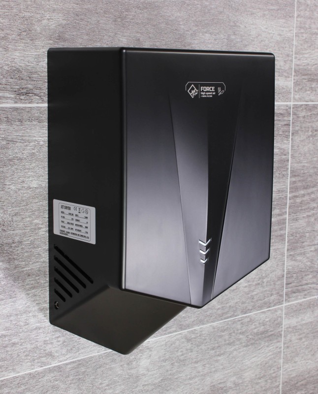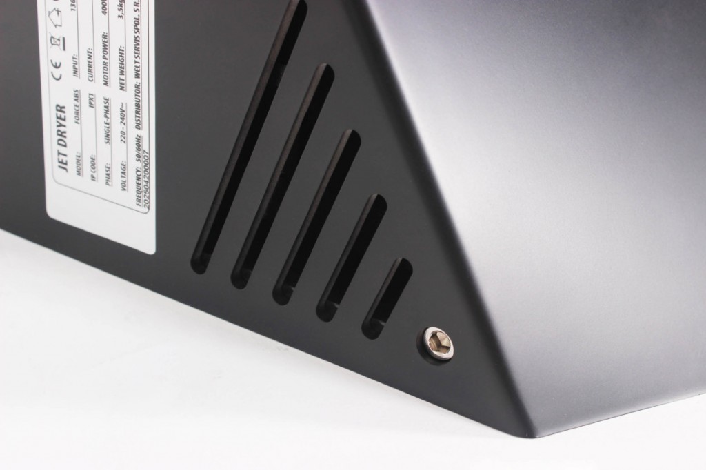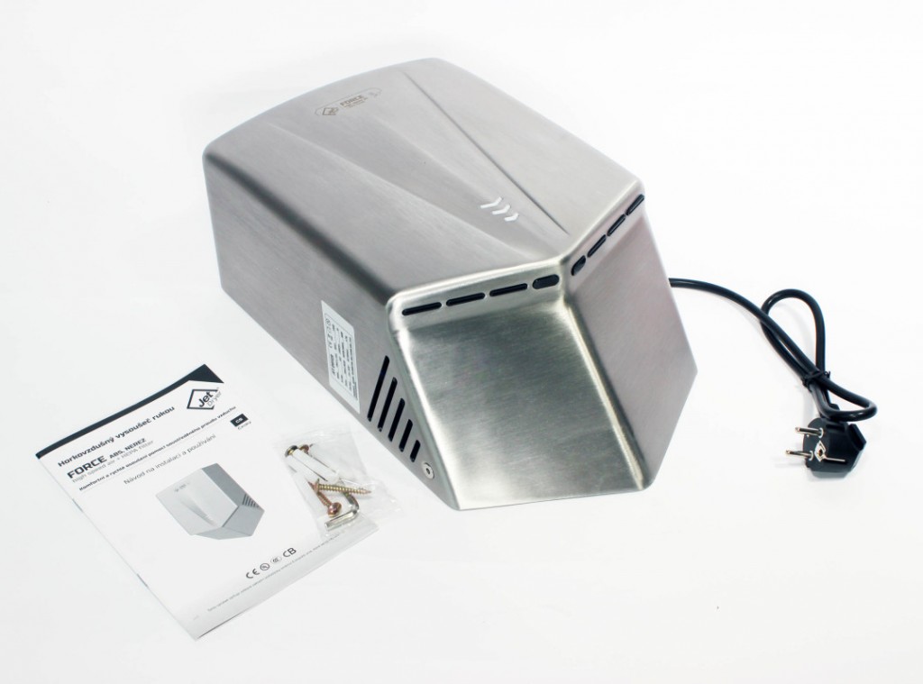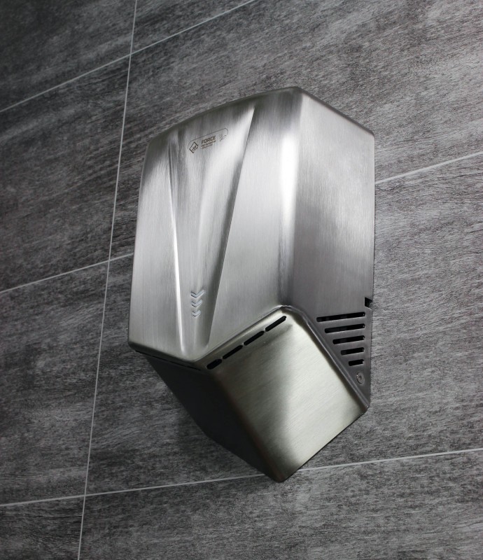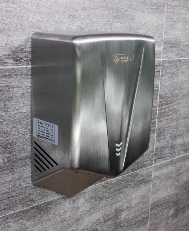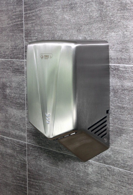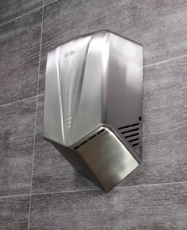Jet Dryer FORCE je k dispozici ve variantě s kartáčovaným nerezovým povrchem nebo odolným bílým nebo černým ABS plastem. Je tak vhodný i do prostředí, kde je zvýšené riziko vandalismu nebo hrubšího zacházení. Kryt z nerezové oceli třídy 304 zaručuje dlouhou životnost a snadnou údržbu.