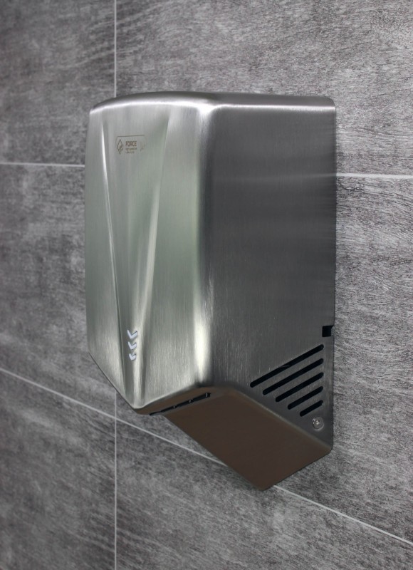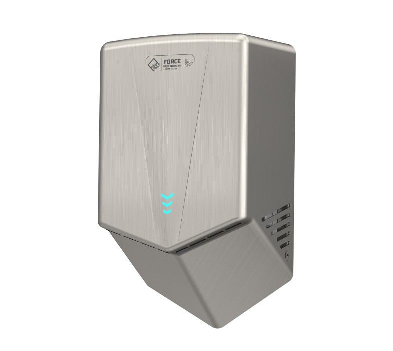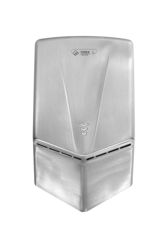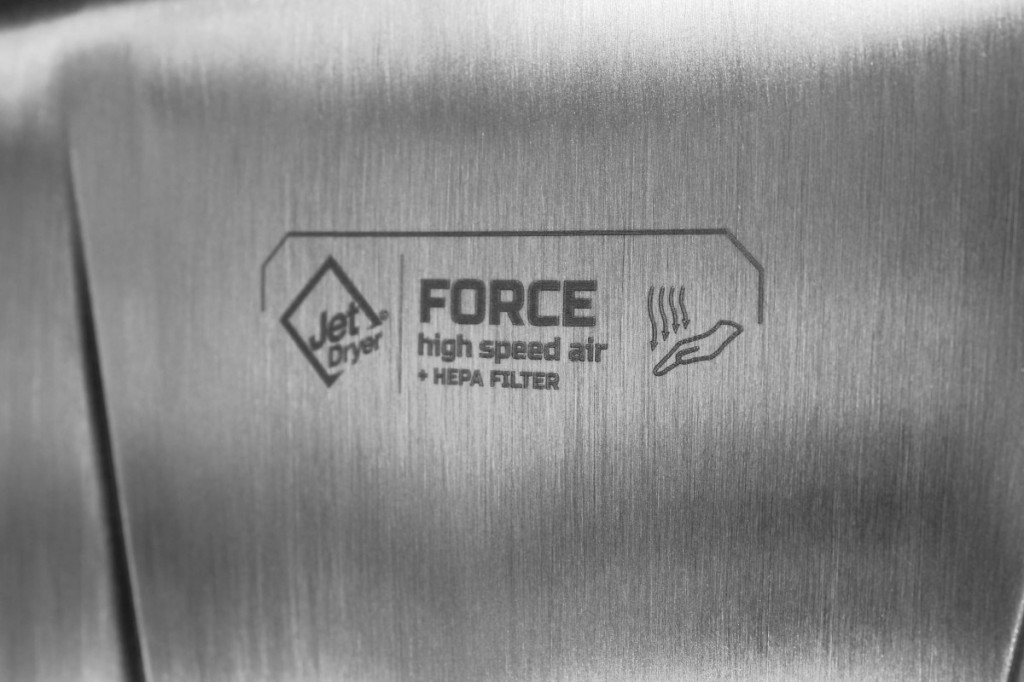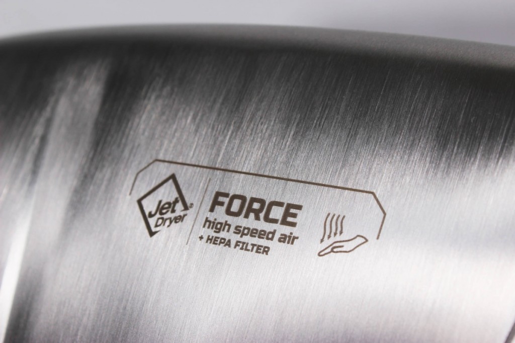 Jet Dryer FORCE je k dispozici ve variantě s kartáčovaným nerezovým povrchem nebo odolným bílým nebo černým ABS plastem. Je tak vhodný i do prostředí, kde je zvýšené riziko vandalismu nebo hrubšího zacházení. Kryt z nerezové oceli třídy 304 zaručuje dlouhou životnost a snadnou údržbu.