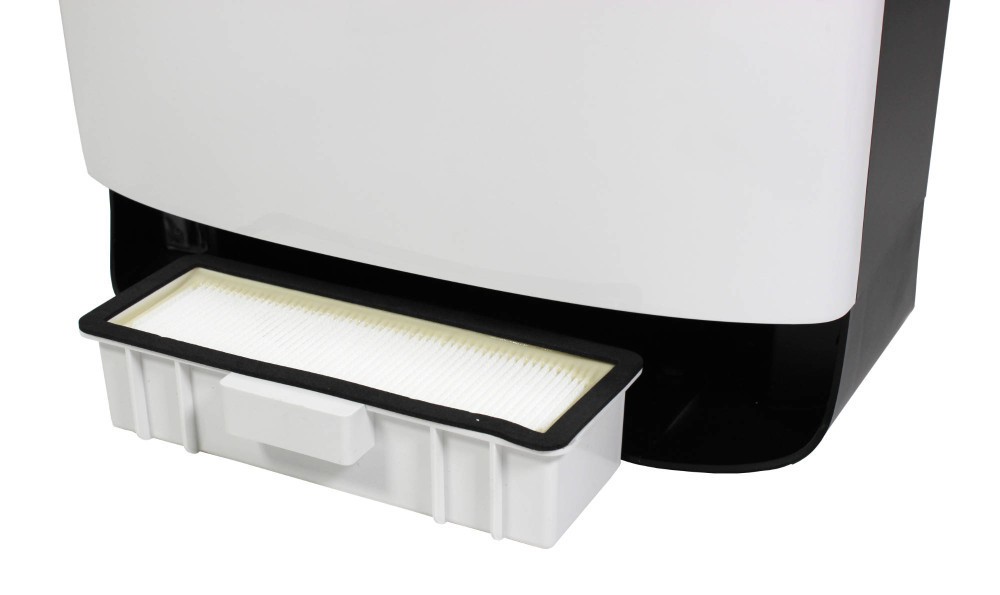 Uchopte a vysuňte odkapovou nádobku z přístroje - vzduchový filtr naleznete za odkapovou nádobkou. Za úchyt na těle filtru vysuňte HEPA filtr z přístroje tažným pohybem k sobě.
