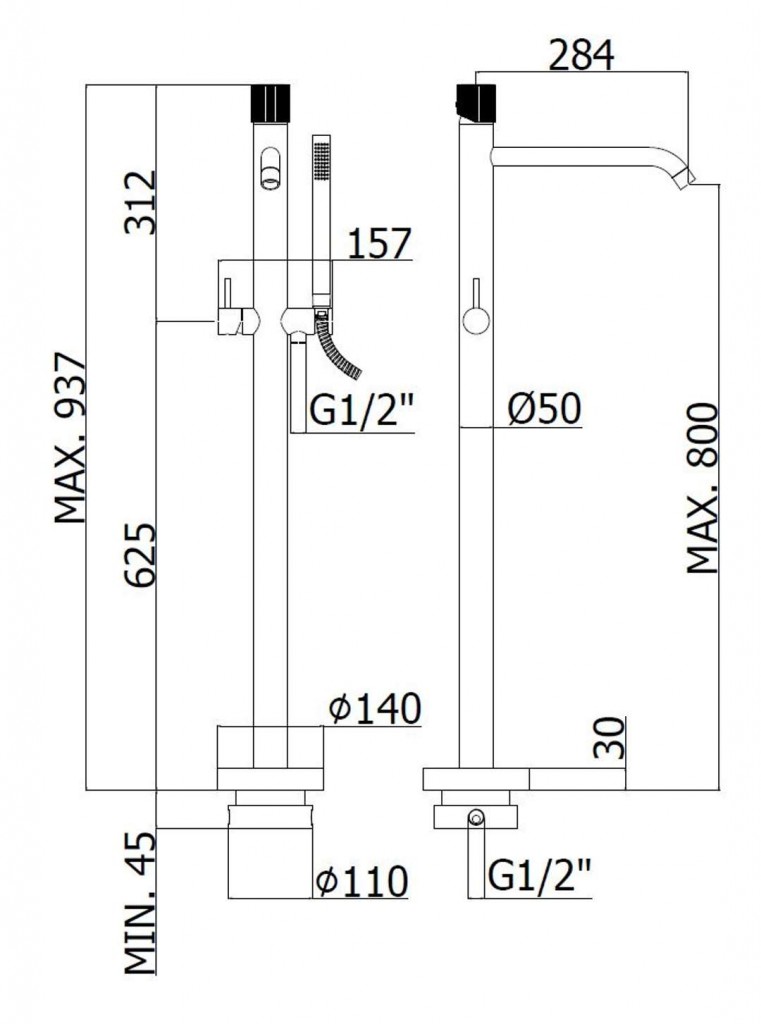 Vanová páková baterie volně stojící na podlaze, s příslušenstvím, bez tělesa