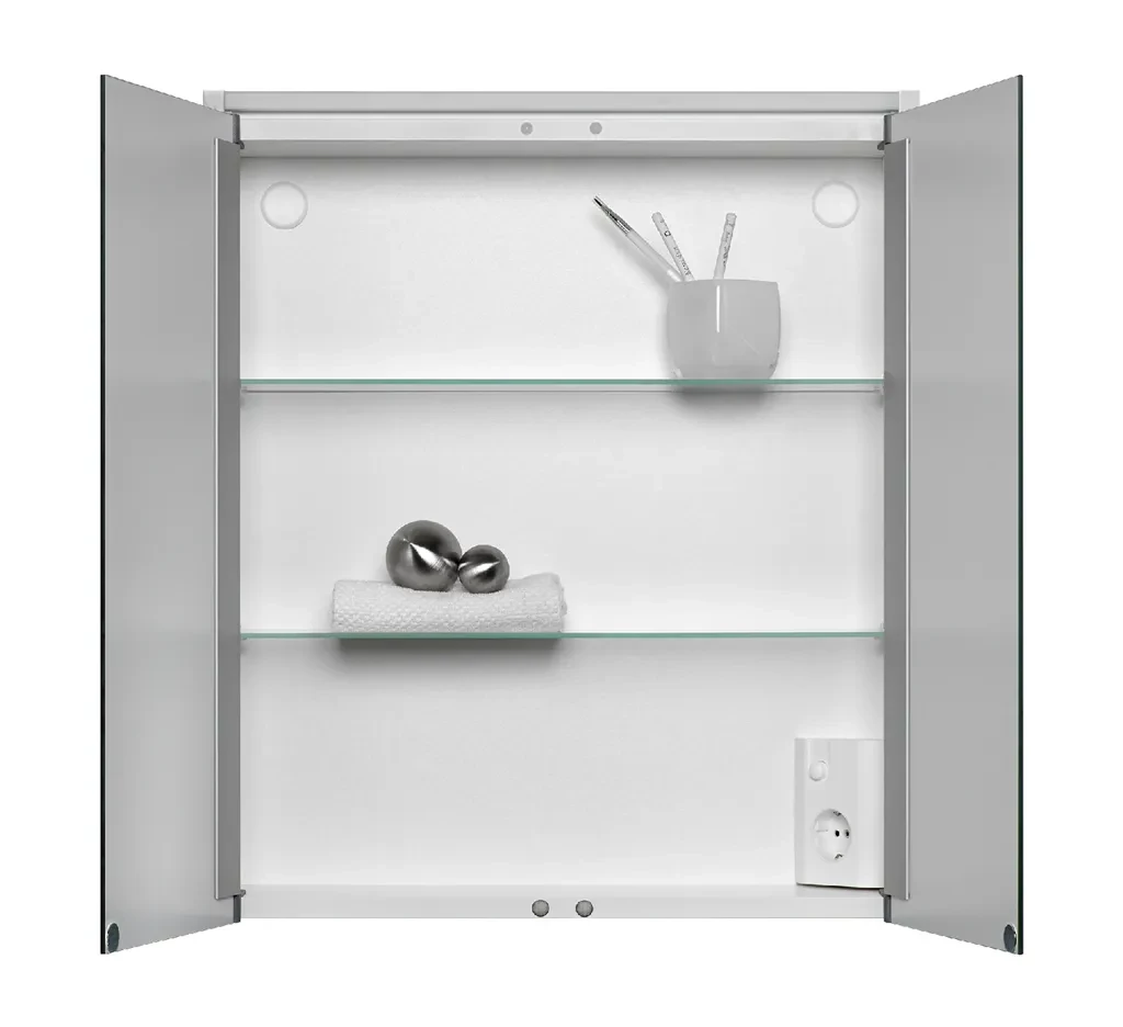 Vybavení: 2 křišťálové sklo zrcadlové dveře, nastavitelné skleněné poličky, bezpečnostní zásuvka a vypínač, centrální zrcadlo