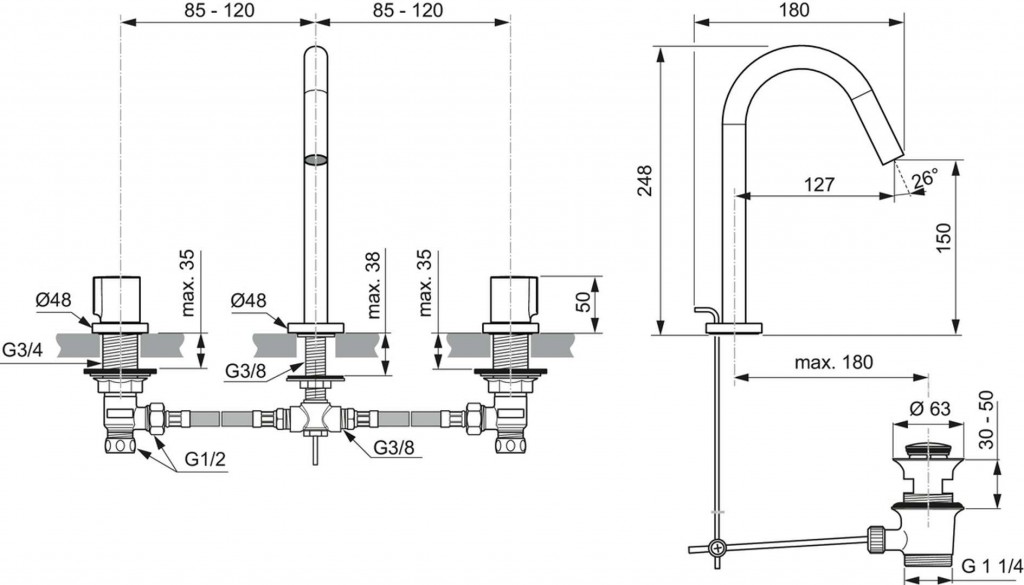 Kohoutková umyvadlová baterie tříotvorová s výpustí