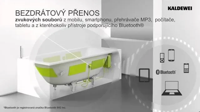 S novou vanou SOUND WAVE nabízí KALDEWEI inovativní koupelnový audiosystém. Prvky systému SOUND WAVE včetně přijímače Bluetooth® jsou skrytě instalovány na ocelové koupací vaně. Ocelová vana přitom funguje jako kvalitní ozvučnice a poskytuje příjemný zvuk nejvyšší kvality.