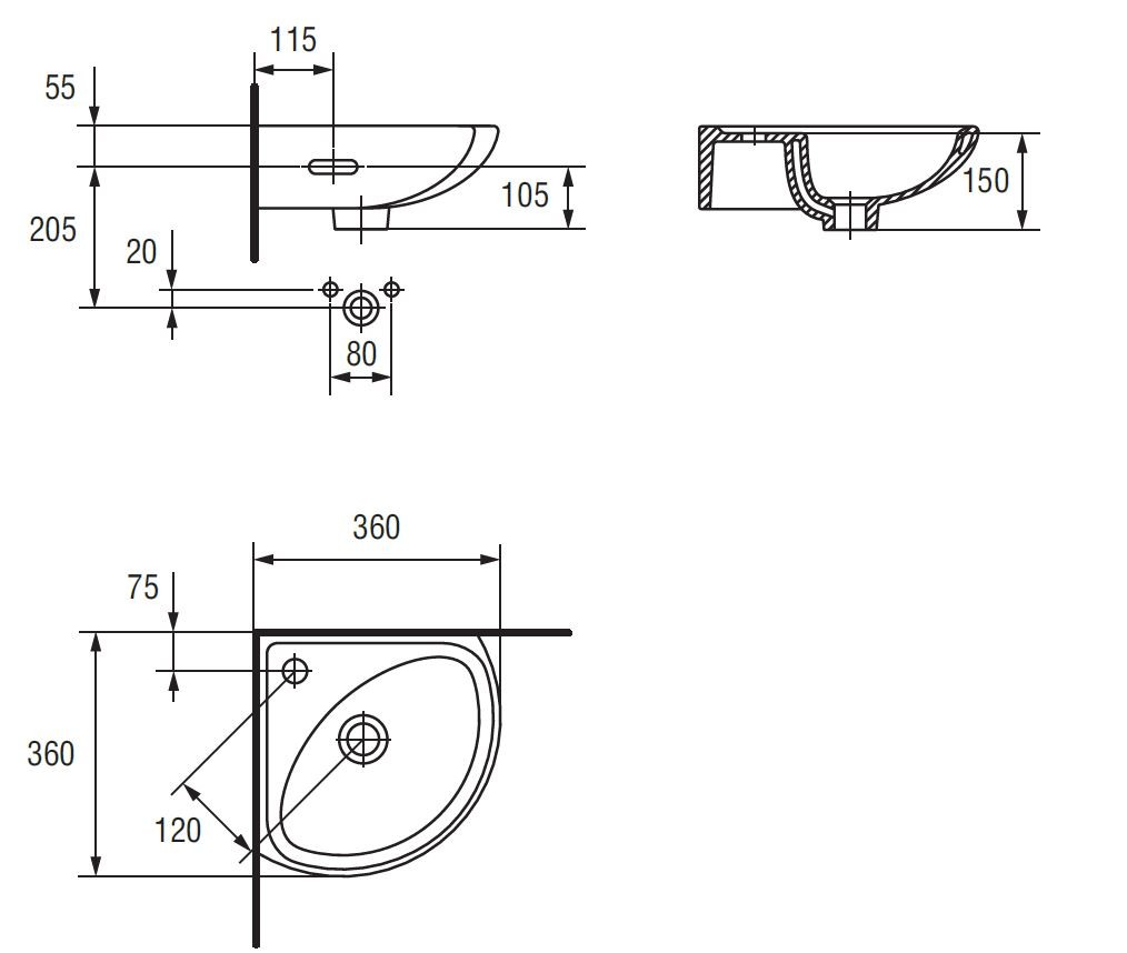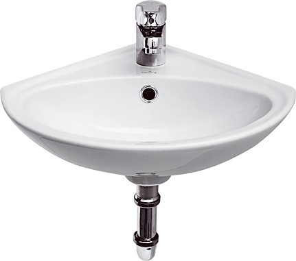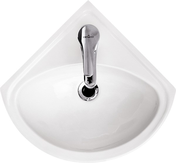 Malé rohové závěsné umyvadlo SIGMA 32 s přepadem a otvorem pro baterii. Lze instalovat s chromovým sifonem.