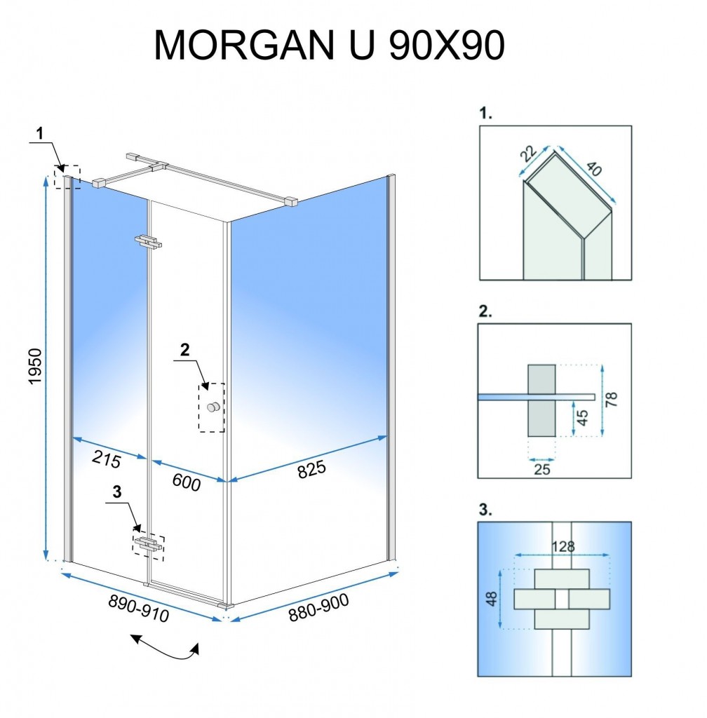 Při navrhování modelu Morgan jsme se zaměřili na modernost, minimalismus a efektivitu. Přidáním originálních dekorativních pantů jsme vytvořili elegantní a zajímavý sprchový kout. Byla použita technologie Nano EasyClean, která způsobuje kondenzaci vody na povrchu skla. Sprchový kout lze instalovat se sprchovou vaničkou nebo s vaničkou s lineárním odtokem.