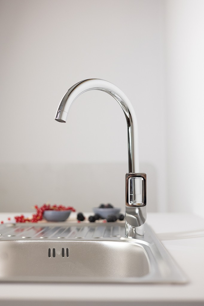 Dřezové baterie KASJA se vyznačují vysokým, pohyblivým výtokem ve tvaru U, který umožňuje snadné mytí nádobí. Charakteristickým prvkem této série je páka s obdélníkovým otvorem, který umožňuje pohodlné používání i s mokrýma rukama. Baterie KASJA jsou k dispozici ve třech povrchových úpravách: chromové, béžové a černé, kterou lze sladit s granitovými dřezy.