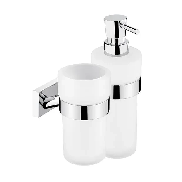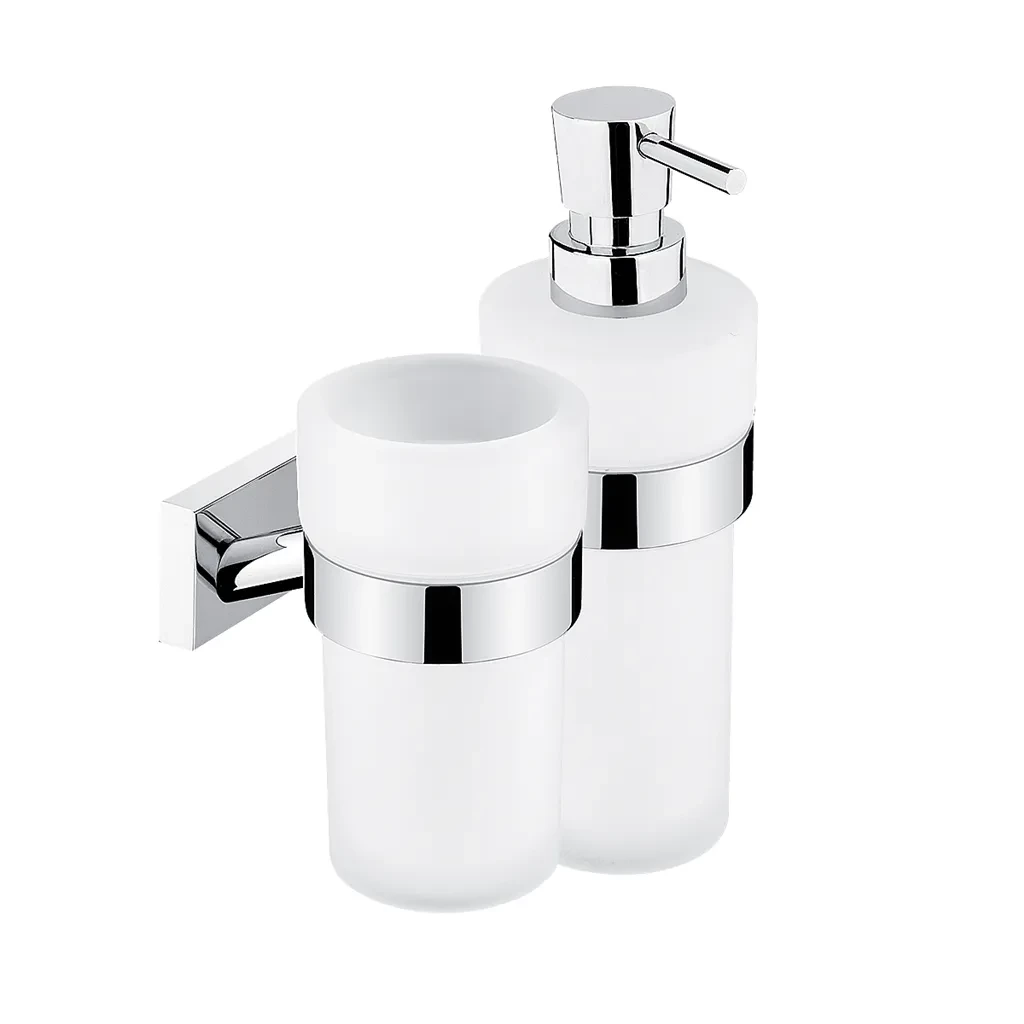 Držák dávkovače a sklenky. Nádobky z matovaného skla. Objem dávkovače 250 ml. Pumpička mosaz/chrom.