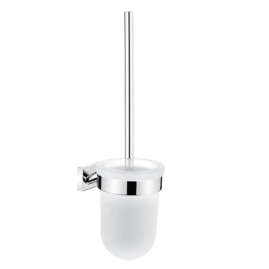 Toaletní WC kartáč. Nádobka nízká z matovaného skla. Úchyt mosaz s povrchovou úpravou chrom.