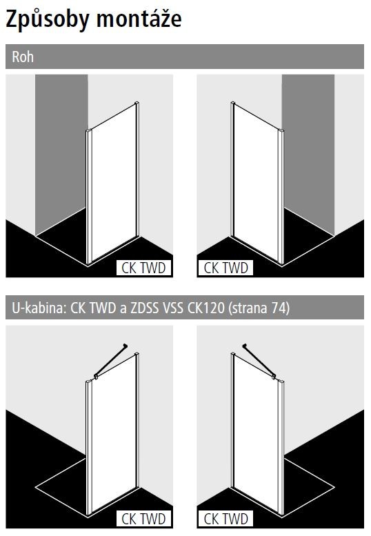 | Instalace | pro kombinaci se všemi Cada XS dveřmi v rohu, v rovině a pro U-kabinu (kromě CK 1KR/L a CK 1NR/L |