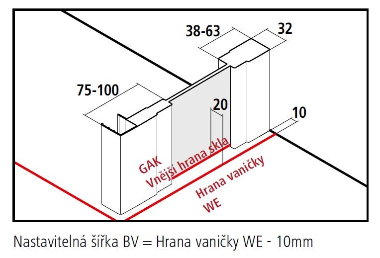 - Částečně rámová boční stěna (nelze instalovat jako Walk-in).