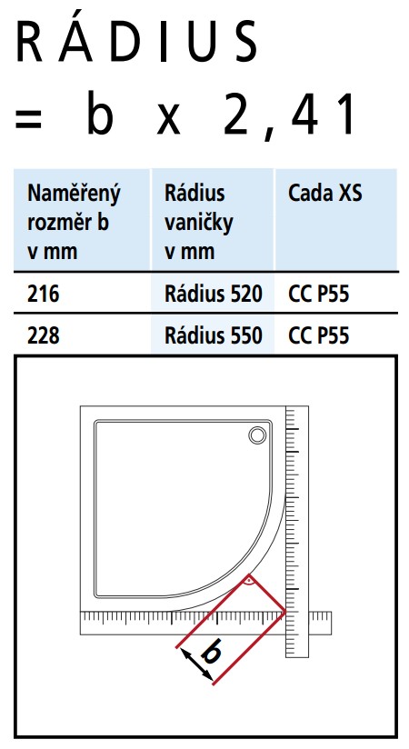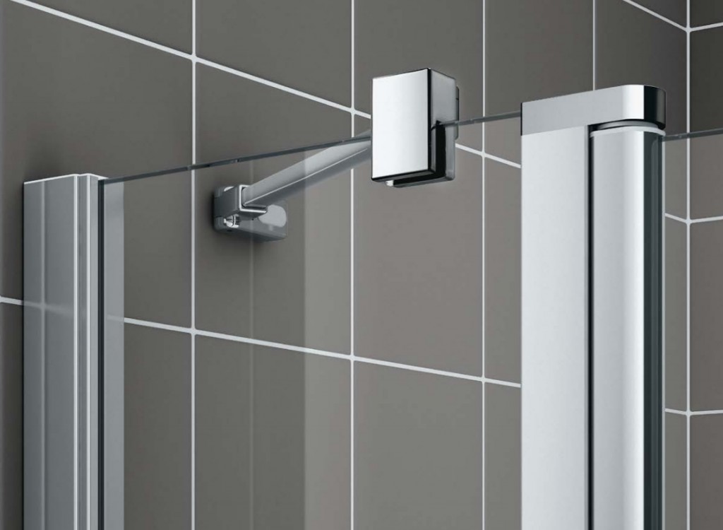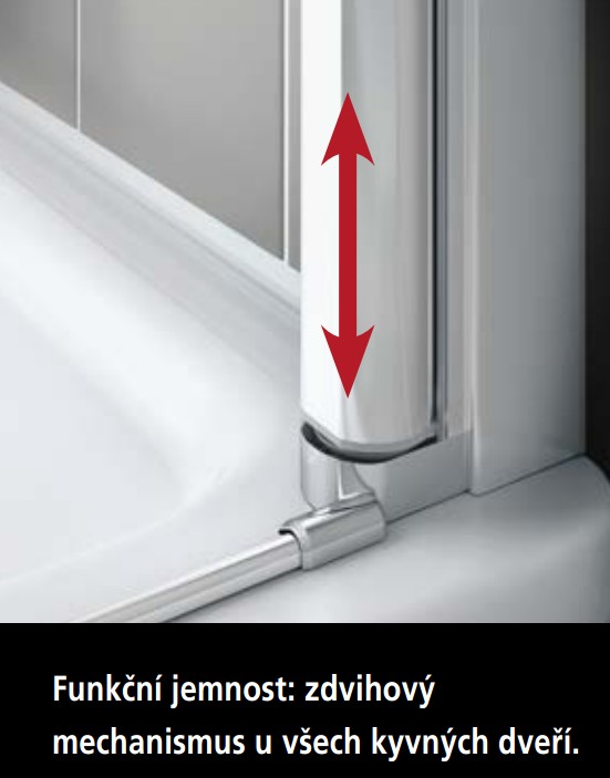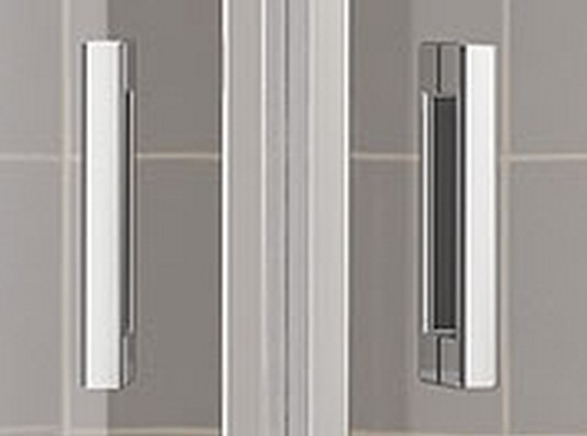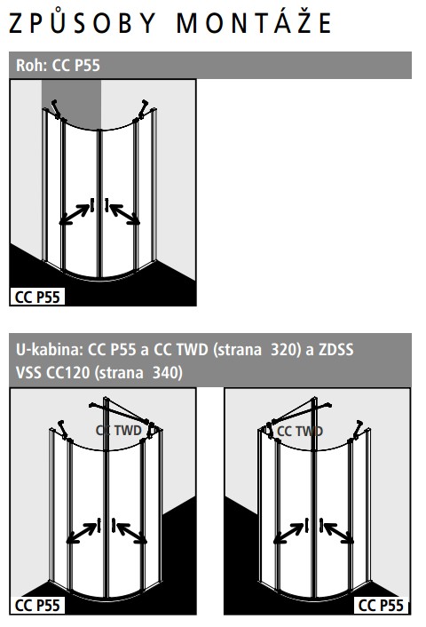 - Částečně rámový dvoukřídlý čtvrtkruhový sprchový kout s pevnými poli, s dveřmi otvíravými dovnitř i ven.
