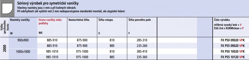 | Charakter | Částečně rámový dvoukřídlý čtvrtkruhový sprchový kout s pevnými poli, s dveřmi otvíravými dovnitř i ven. |