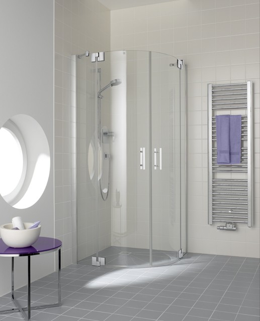 - Částečně rámový dvoukřídlý čtvrtkruhový sprchový kout s pevnými poli, s dveřmi otvíravými dovnitř i ven.