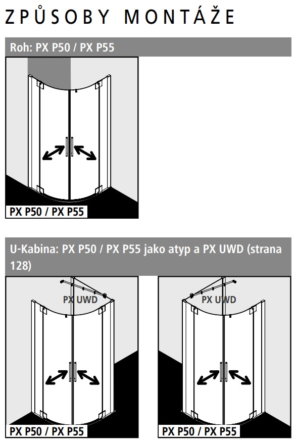 - Částečně rámový dvoukřídlý čtvrtkruhový sprchový kout s pevnými poli, s dveřmi otvíravými dovnitř i ven.