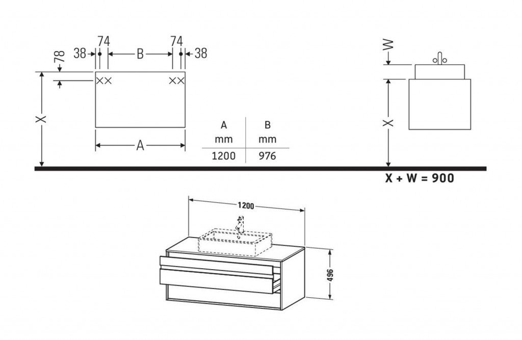 - Nosná horní deska s výřezem pro instalaci umyvadla uprostřed je součástí balení