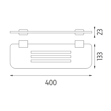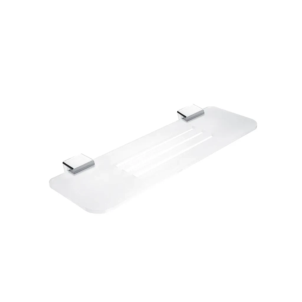 Police s frézovanými otvory. Materiál plexiglass s matovaným povrchem. Délka 40 cm. Úchyty mosaz / chrom.
