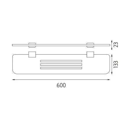 Police s frézovanými otvory. Materiál plexiglass s matovaným povrchem. Délka 60 cm. Úchyty mosaz / chrom.