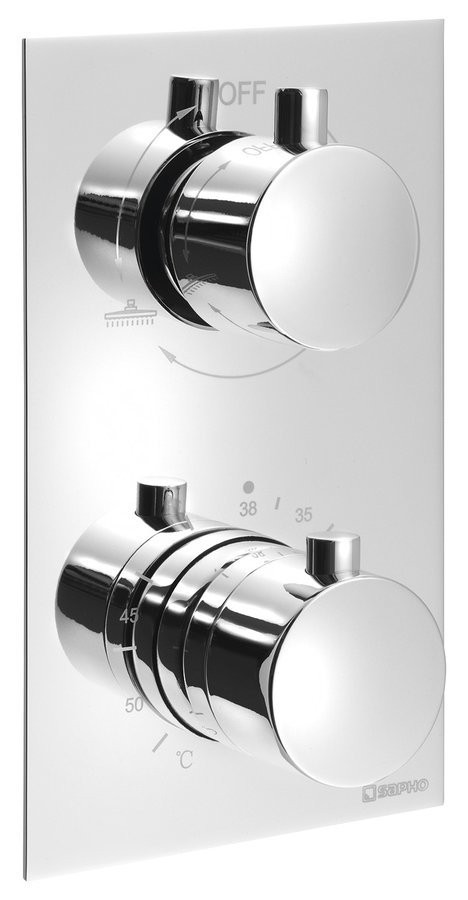 Termostatická baterie je z výroby nastavena na teplotu vody 38 °C. Po puštění vody otočením horní rukojeti tedy poteče voda o teplotě 38 °C. Pokud budete chtít vodu chladnější, stačí otočit spodní rukojetí směrem doprava. Pokud budete požadovat naopak vodu teplejší, zmáčkněte bezpečnostní STOP pojistku a otáčejte rukojeť směrem doleva. Průtok vody a to, zda voda poteče z ruční nebo z hlavové sprchy, si volíte otáčením horní rukojeti doleva, resp. doprava.
