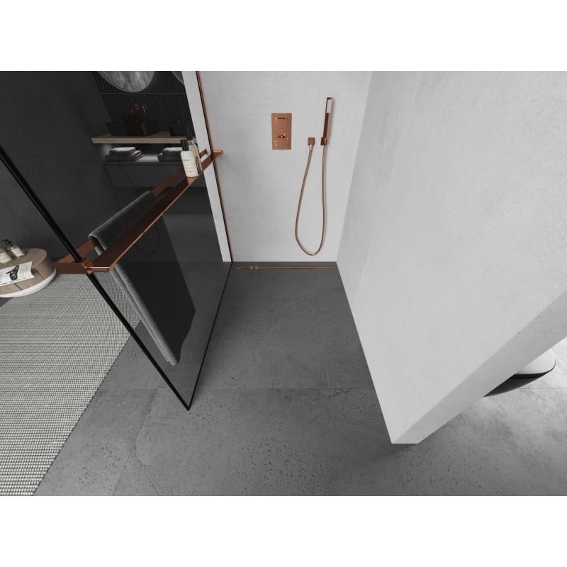 Sprchovou zástěnu je možné instalovat na sprchovou vaničku nebo přímo na podlahu s kombinací odtokového žlabu. Pokud vyberete odtokový žlab stejné barvy, jako máte profil, vzpěru a polici, bude sprchová část vypadat velmi elegantně.