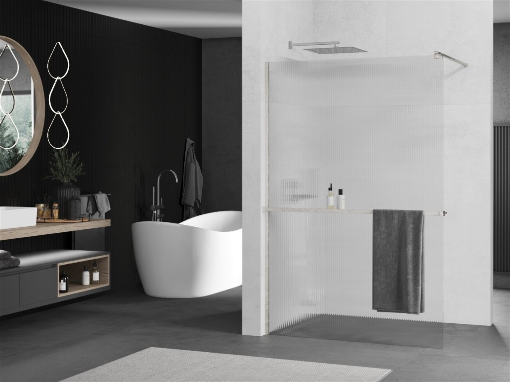 Elegantní sprchové zástěny WALK-IN KIOTO s praktickou hliníkovou poličkou a držákem ručníků od výrobce MEXEN. Zástěna je vyrobena z tvrzeného skla o síle 8 mm a výšce 200 cm. Instaluje se pomocí hliníkových profilů s možností vyrovnání nerovností stěny a je ukotvena 150 cm stabilizační vzpěrou z nerezové oceli, kterou lze zkrátit na požadovanou délku.