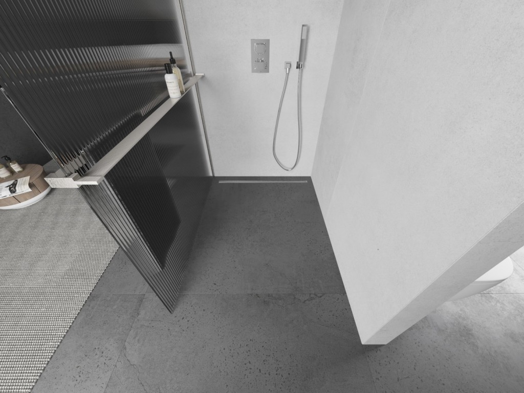 Sprchovou zástěnu je možné instalovat na sprchovou vaničku nebo přímo na podlahu s kombinací odtokového žlabu. Pokud vyberete odtokový žlab stejné barvy, jako máte profil, vzpěru a polici, bude sprchová část vypadat velmi elegantně.