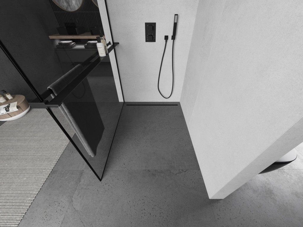 Sprchovou zástěnu je možné instalovat na sprchovou vaničku nebo přímo na podlahu s kombinací odtokového žlabu. Pokud vyberete odtokový žlab stejné barvy, jako máte profil, vzpěru a polici, bude sprchová část vypadat velmi elegantně.