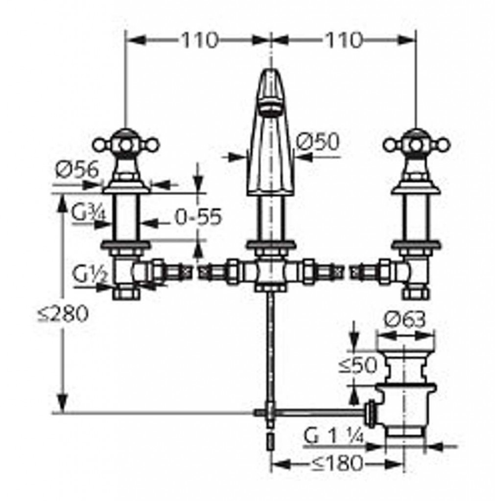 Stojánková umyvadlová baterie Adlon, tříotvorová instalace