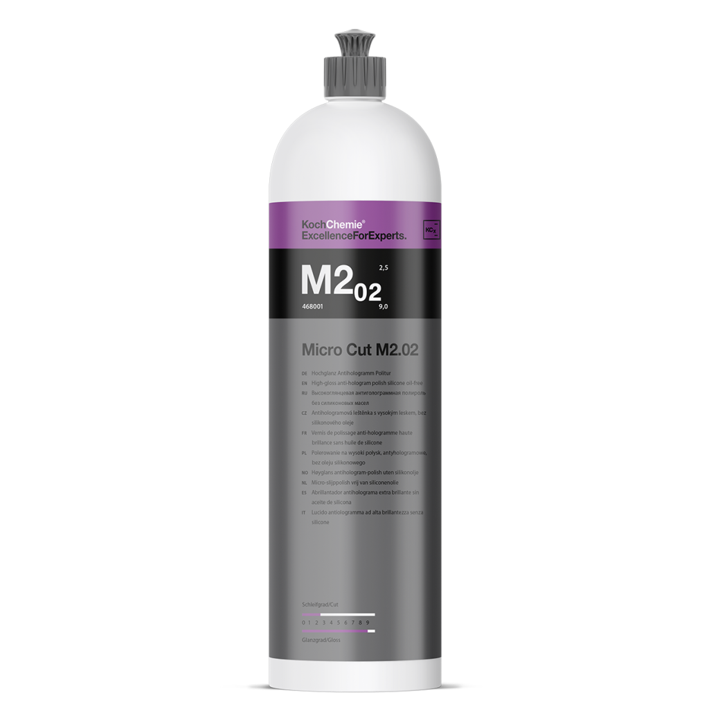 Popis přípravku: Antihologramní leštěnka s vysokým leskem bez silikonového oleje M2.02 je určena pro strojové leštění pro trvalé odstranění stop po leštění, hologramů, jemných škrábanců a broušení od zrnitosti 4000 na všech lakovaných plochách (včetně odolných proti poškrábání). Díky použití vysoce specializovaných a extrémně homogenních brusných částic se dosáhne na tmavých a podobně citlivých barevných odstínech při extrémních světelných podmínkách brilantní a trvale vysoký lesk. Hologramy a jemné škrábance se mechanicky odstraní. Antihologramní leštěnka Micro Cut M2.02 se snadno rozleští a lze ji odstranit beze zbytků.