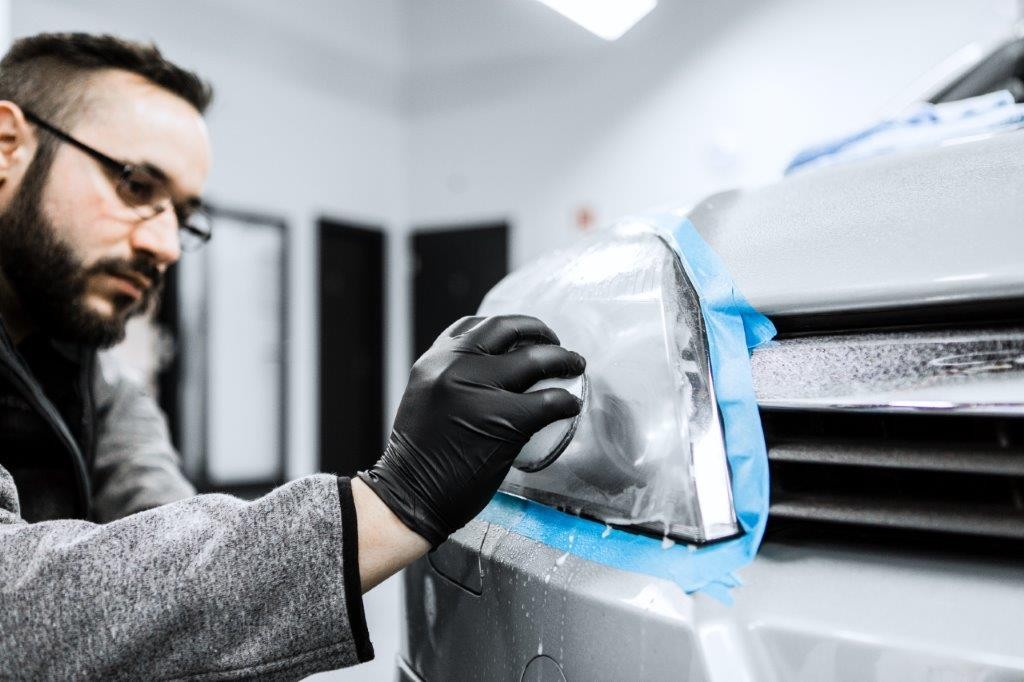 1. Před leštěním oblepte okraje světlometů páskou a opláchněte čistou vodou. 2. V případě silného zažloutnutí nebo poškození nejdříve použijte ruční aplikátor a postupně všechny tři brusné papíry od zrnitosti 1000, 2000 až do zrnitosti 4000. Mezi jednotlivými kroky broušení světlomet vždy opláchněte čistou vodou.